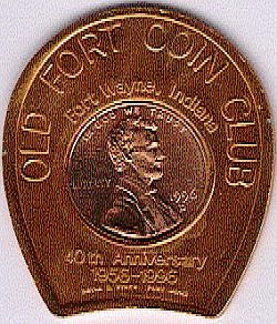 Gold colored horseshoe shaped encased 1996 D cent. Obverse reads: "OLD FORT COIN CLUB / Fort Wayne, Indiana / 40th Anniversary / 1956-1996 / BRYAN G. RYKER FORT WAYNE" Bryan G. Ryker is in very small text as was done by Earl Fankhauser.
