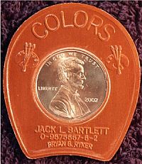 Above are the six "Colors" Horseshoe shaped encased. The text reads - "COLORS / JACK L. BARTLETT / 0-9675667-6-2 / BRYAN RYKER" each contains a 2002 cent. An artist's pallet with three brushes appears on the left and right at the cent's head. (-Editor)